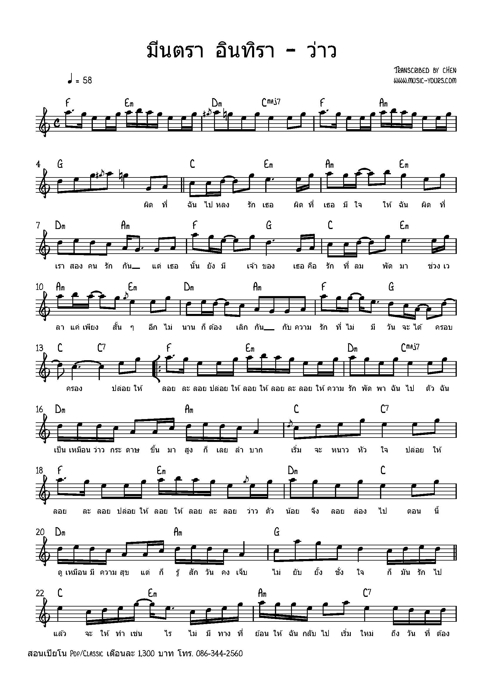 มีนตรา อินทิรา - ว่าว โน้ตเปียโน เรียนเปียโน สอนเปียโน เปียโนป๊อป